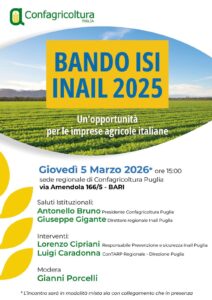 Confagricoltura Puglia organizza l’incontro “Bando ISI INAIL 2025 – Un’opportunità per le imprese agricole italiane”, dedicato alle opportunità offerte dal bando per sostenere investimenti in prevenzione e sicurezza nelle aziende del comparto. L’appuntamento è per giovedì 5 marzo 2026, ore 15.00, nella sede regionale di Confagricoltura Puglia (via Amendola 166/5 – Bari), con partecipazione in modalità mista: in presenza e con collegamento da remoto.