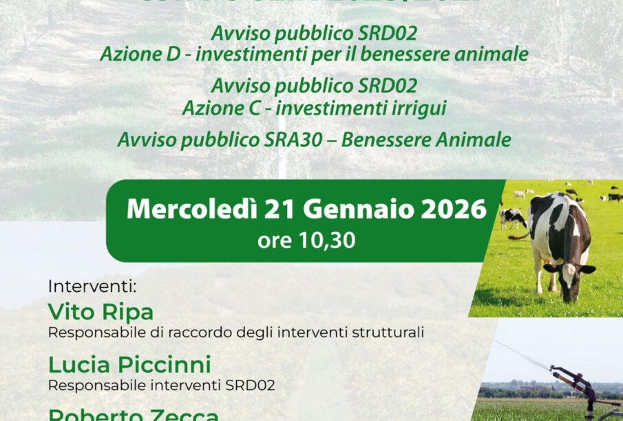 Si terrà mercoledì prossimo, 21 gennaio 2026, alle ore 10.30 il webinar Bandi Csr Puglia 2023-2027. Organizzato da Confagricoltura Puglia, durante l’incontro in videoconferenza saranno presentati i bandi per: