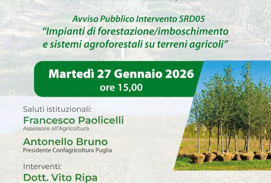 Martedì 27 gennaio 2026 alle ore 15 Confagricoltura Puglia promuove un webinar informativo dedicato ai bandi del CSR Puglia 2023-2027, con un focus specifico sull’Avviso Pubblico relativo all’Intervento SRD05, rivolto a impianti di forestazione/imboschimento e a sistemi agroforestali su terreni agricoli.